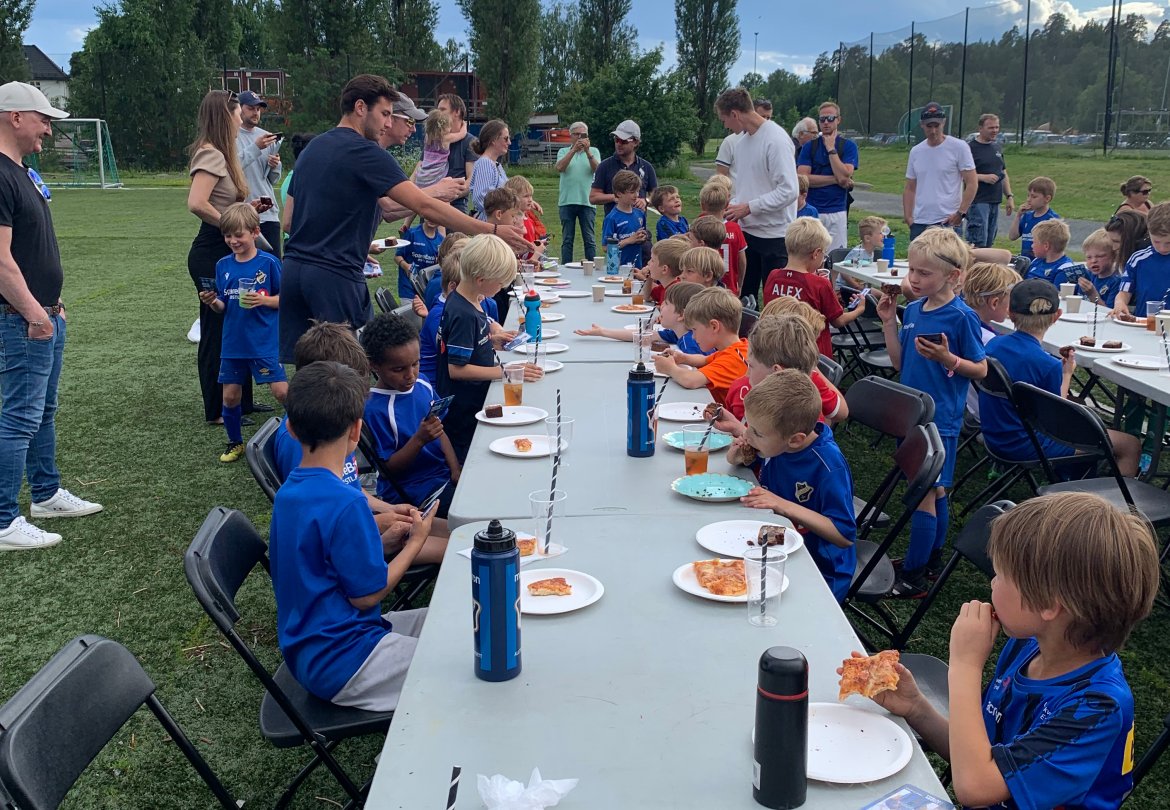I overkant av 50 ivrige fotballgutter spilte først cup på Nadderud Arena, før det ble pizzafest og premieutdeling i Fanzone. Våre A-lagsfaddere, Nicolas Pignatel Jenssen og Marius Ulla, kom også innom for å hilse på - til stor glede for barna. Etter to sesonger med treninger under pandemien, var det utrolig hyggelig for guttene og samles på et slikt arrangement.