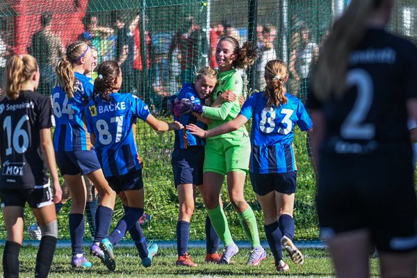 To minutter før slutt så slår Oda et frispark inn i feltet, som til slutt ender hos Saga som får avsluttet og ballen daler i mål. Jubelen står i taket for alle 22, og etter to nye minutter med strålende forsvarsspill, så kommer sluttsignalet og alle 22 kan feire en fantastisk lagseier sammen på banen.