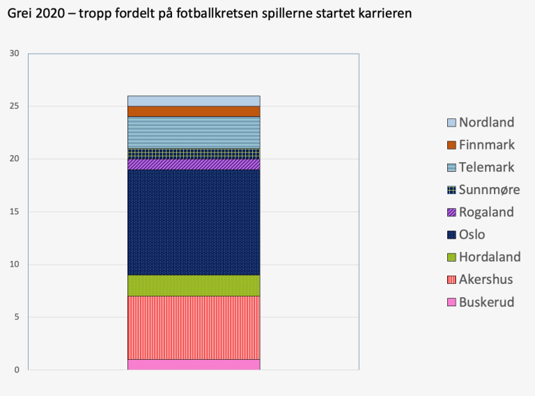 Totalt er det 17 spiller – eller drøyt 65% av stallen, som kommer fra Oslo eller Akershus. (Før noen begynner å mase om Viken, minner vi om at vi snakker fotball-kretser - ikke fylker).