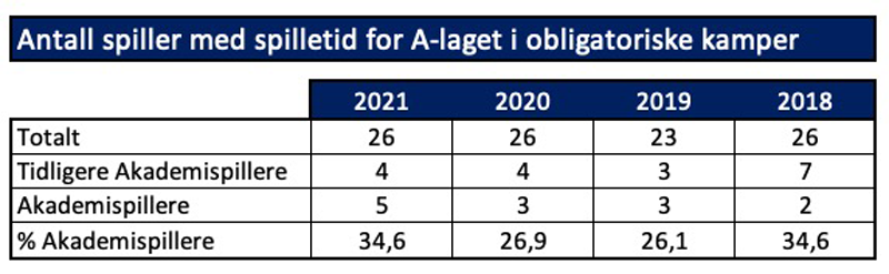 Det er alltid en balanse hvor mange akademispillere en skal ha med på A-lagets treninger. I perioden med pandemi har det også vært begrensninger med tanke på bytting av kohort og andre praktiske hensyn og utfordringer. Likevel har mange akademispillere fått slippe til:
