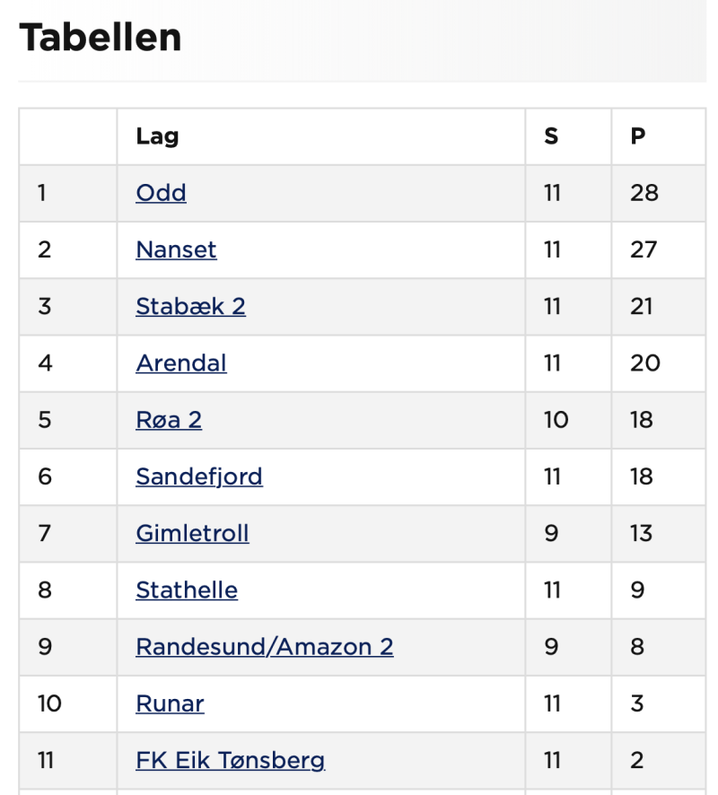 Det er 11 lag i vår avdeling og serien er halvspilt – og vel så det. Odd leder og er favoritt til å vinne avdelingen foran Nanset. Bak disse to lagene er det et bikkjeslagsmål for å bli nummer tre og fire. Kampen stå mellom Stabæk 2, Arendal, Røa 2, Sandefjord og Gimletroll.