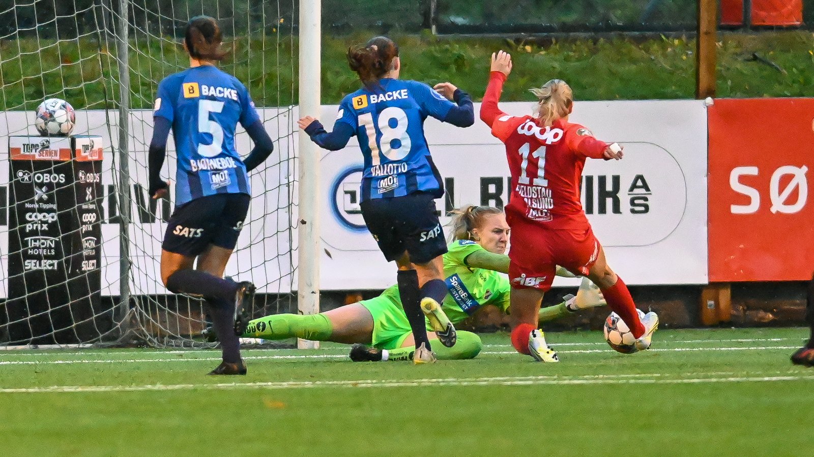 Uret viser 23 minutter da Brattberg Lund kjører på med et hardt skudd på Skoglund, men ender i corner. Nytt skudd kommer mot Skoglunds nettmasker fra en skytter vi kjenner godt, Justine Kvaleng Kielland som tester skuddfoten fra god avstand. Fortsatt målløst på Vestlandet.