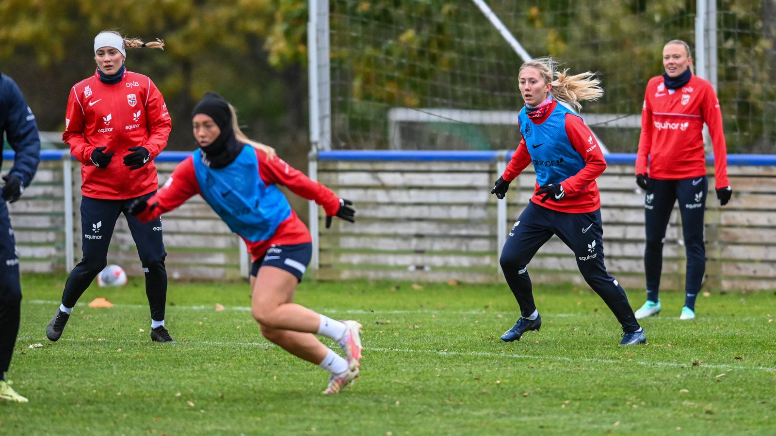 Silje Skaara Helgesen og Iris Omarsdottir spilte begge på samme lag under mandagens internkamp, der keeperne inklusive Sunniva Skoglund rullerte.