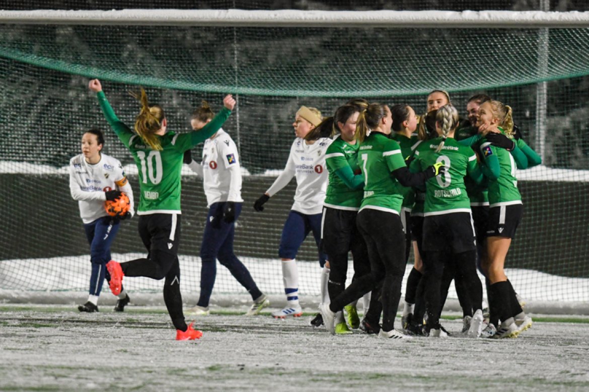 Men den gang ei. To scoringer på overtid, først Melissa på en perle av et langskudd og så Cornelia etter frispark, gjorde at statistikken mot de grønne fra Sørlandet fortsatt er fryktinngytende.