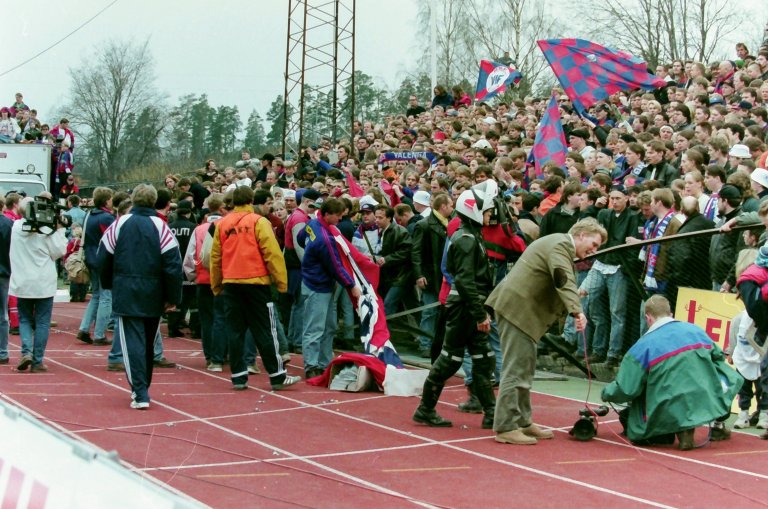 - Det var 13.000 på kampen, 8000 mer enn det var plass til. Folk hang i lysmastene og gjerdene brøyt sammen. Folk trillet ned fra det som da var hovedtribunen. Den gangen hadde vi etablert «Bærget de Smaa». To av dem som trillet ned og ble liggende var tidligere kaptein Morten Morisbak Skjønsberg og Henning Hauger. Alt kollapset, vi skjønte ikke hva som traff oss. Klansmedlemmer løftet sikkerhetssjef og altmuligmann Arild Thorp, bar han ned til Kiwi og satte han bak kassa der. Det er helt sant!