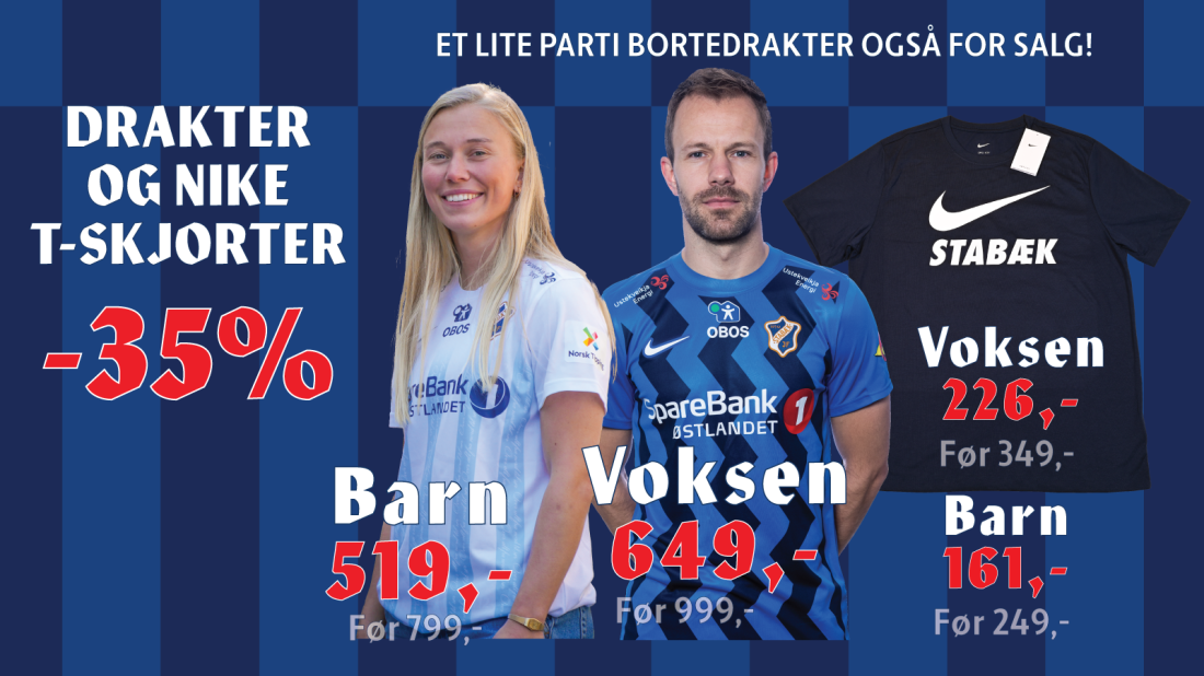 Mot Raufoss kjørte vi draktkamp, og vi satte stor pris på at mange kledde seg i blaa drakter, og flere slo til på drakttilbudet i butikken. Vi fortsetter derfor med tilbud på årets drakter, som kan kjøpes til rabatterte priser i Stabæk-butikken før og etter kamp søndag.