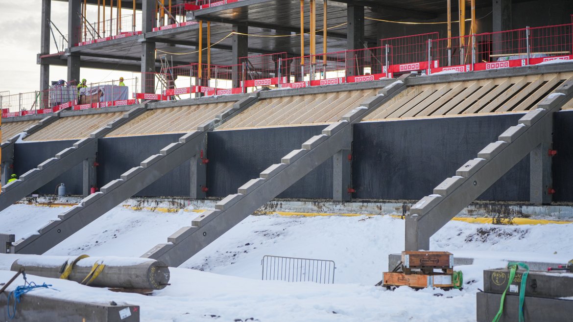 Bunnplatene til stadionbygget armeres og støpes fortløpende. Gulvet til den første langsiden nærmer seg ferdig, og arbeidene med kortsiden i vest er allerede godt i gang. I øst pågår graving, legging av rør og bunnledninger og avretting som forberedelse for betongarbeidene.