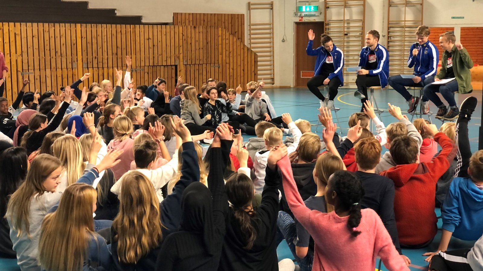 Latter og spørsmål satt løst, da 80 nysgjerrige åttendeklassinger og tre kloke fotballspillere fant tonen en mørk novemberdag i skolens gymsal.