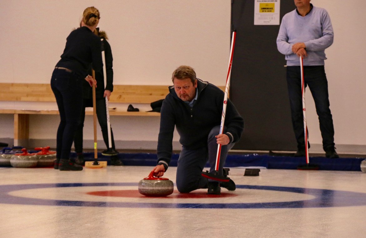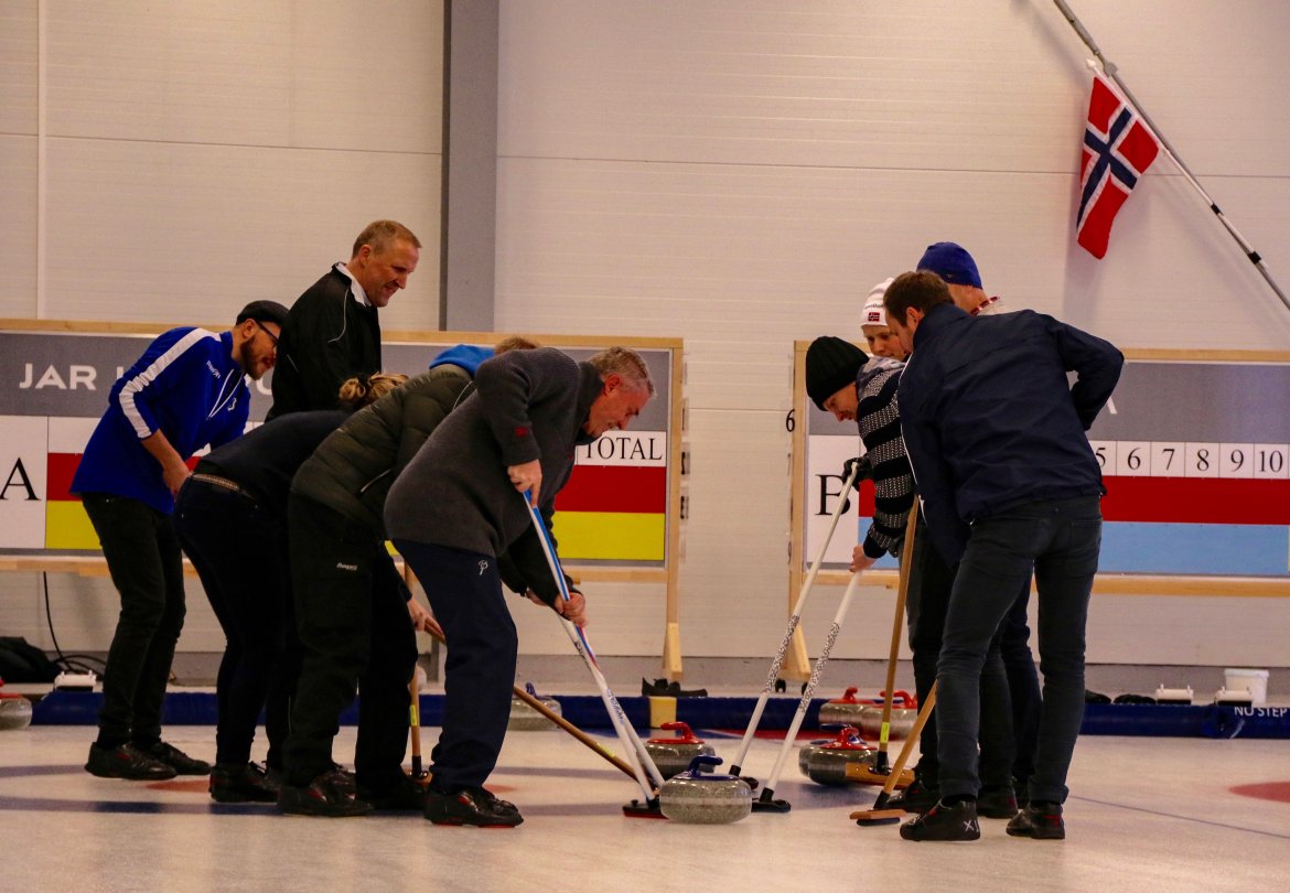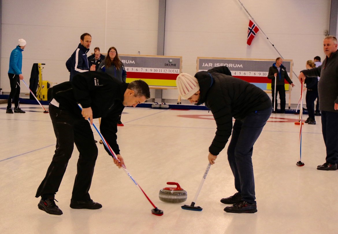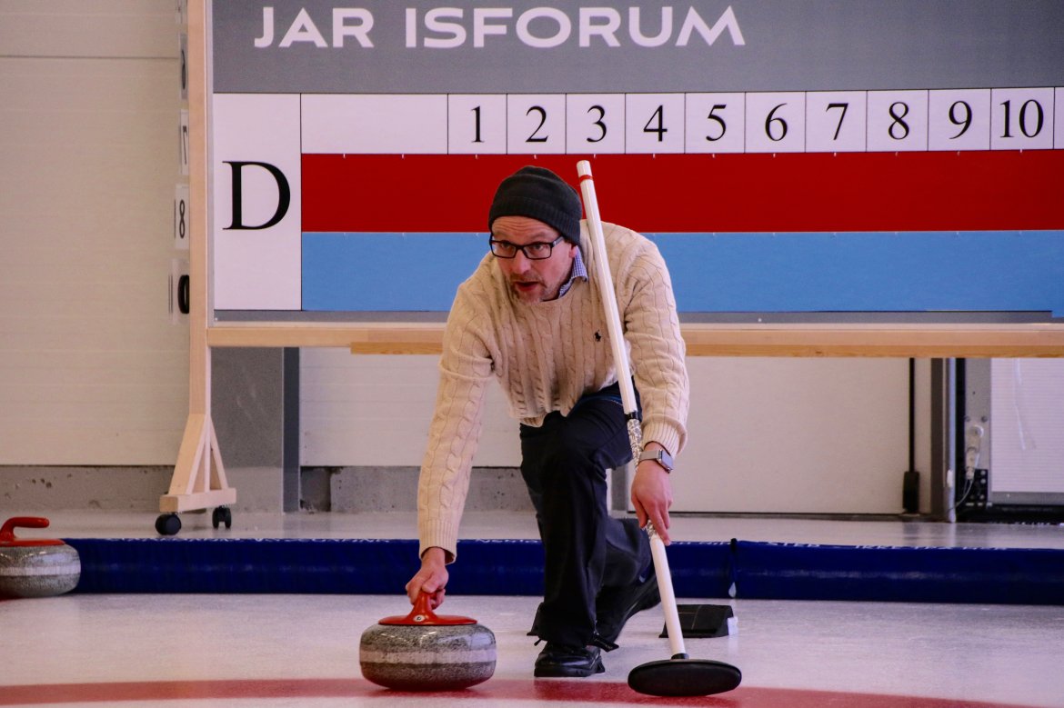 Over 50 personer var samlet hos Jar Isforum for å utfordre hverandre, og seg selv, i curling. Vi ble som vanlig tatt godt imot og alle partnere fant sko som passet. Noen startet riktignok med to ‘glatte’ såler før man fant ut av at det er greit å ha en som sklir og en man kan sparke fra med. En støttekost ble også satt stor pris på.