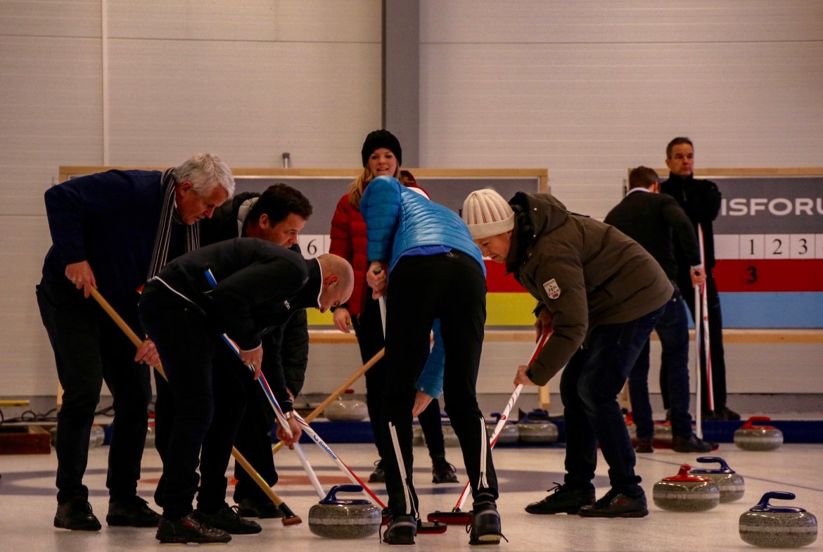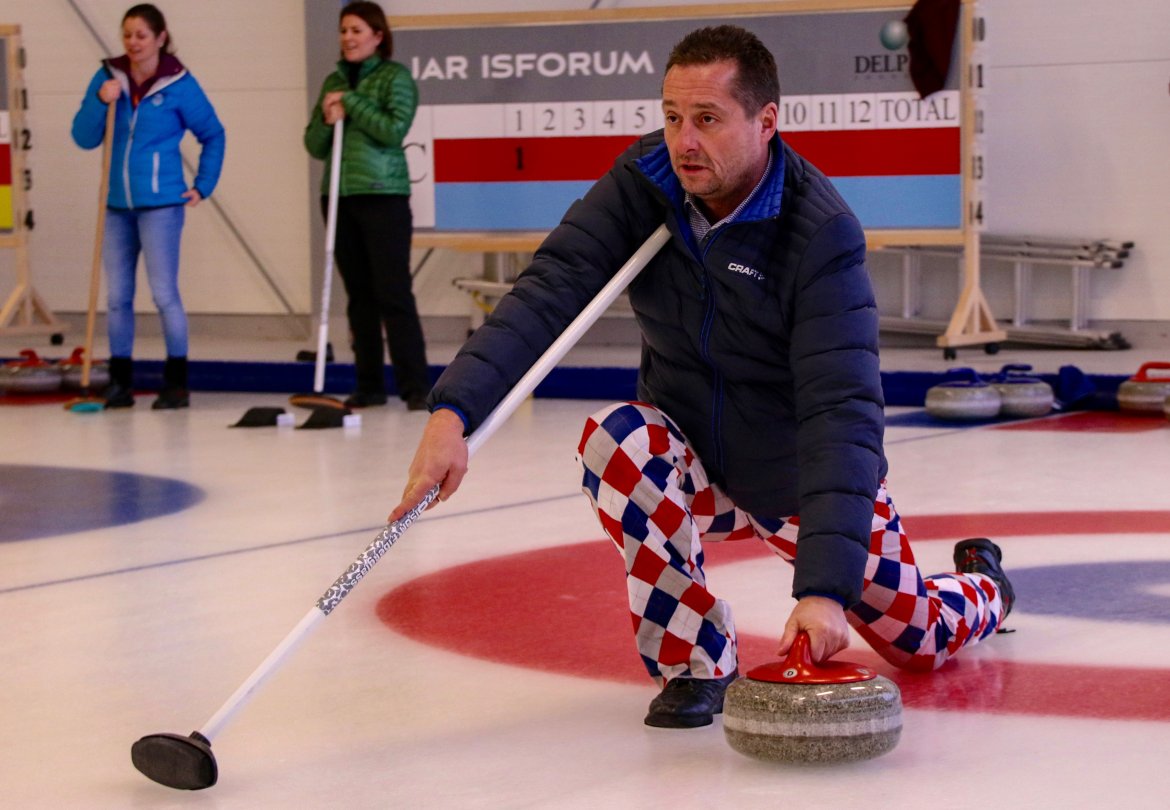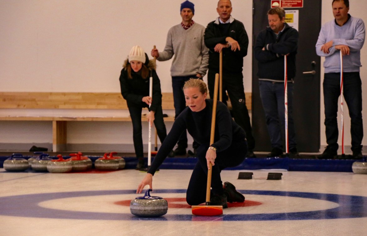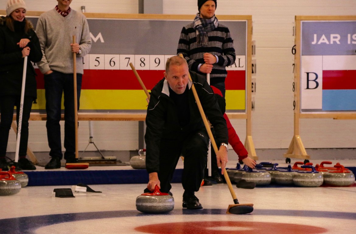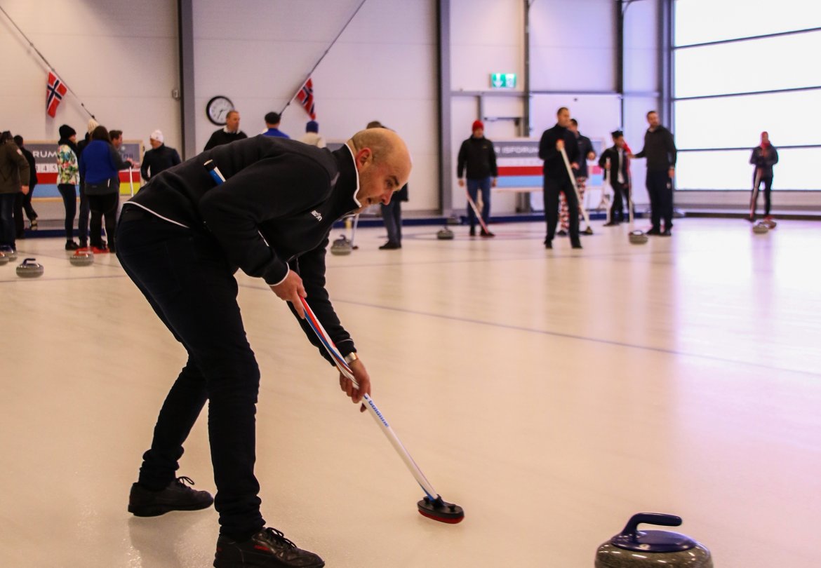 Over 50 personer var samlet hos Jar Isforum for å utfordre hverandre, og seg selv, i curling. Vi ble som vanlig tatt godt imot og alle partnere fant sko som passet. Noen startet riktignok med to ‘glatte’ såler før man fant ut av at det er greit å ha en som sklir og en man kan sparke fra med. En støttekost ble også satt stor pris på.