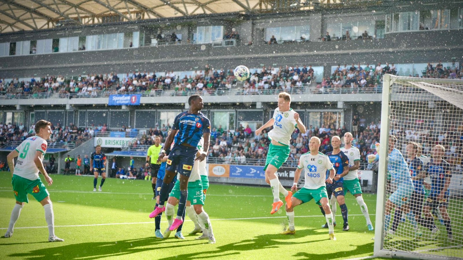 Vi trengte bare 2,5 minutt på å skape første, store sjanse i kampen. På corner fikk Bakenga satt inn en presis heading, men HamKam-keeper leverte enorm reaksjonsevne da han fikk slått vekk ballen.