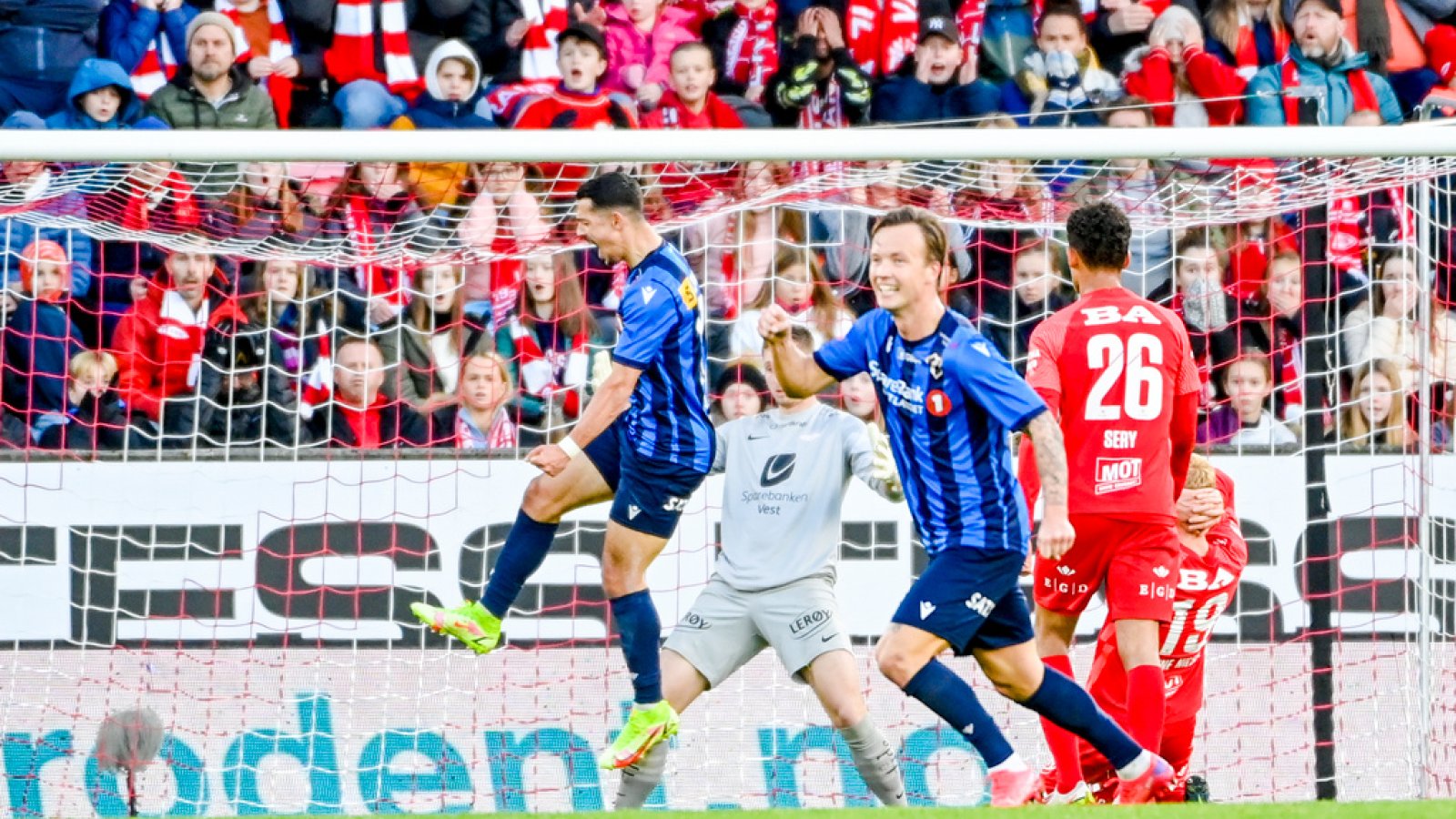 69. minutt: Brann trykker. Strand løper med ballen like utenfor straffefeltet, og blir truffet kontant av Wangberg. Frispark fra ca. 20 meter, rett foran mål.