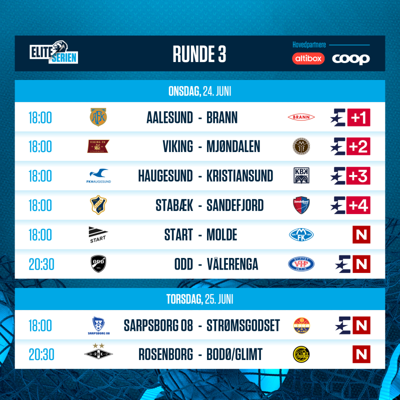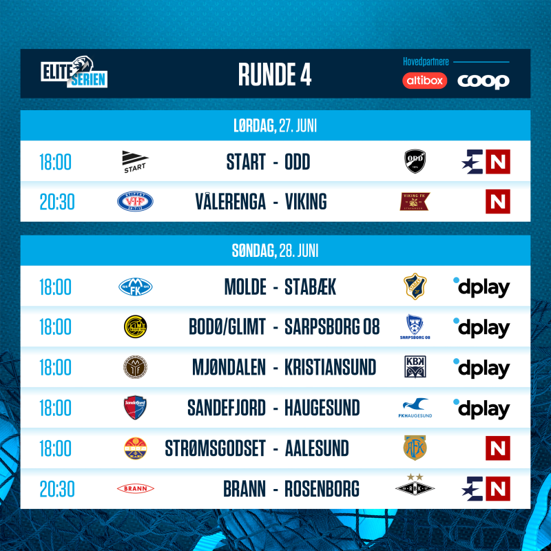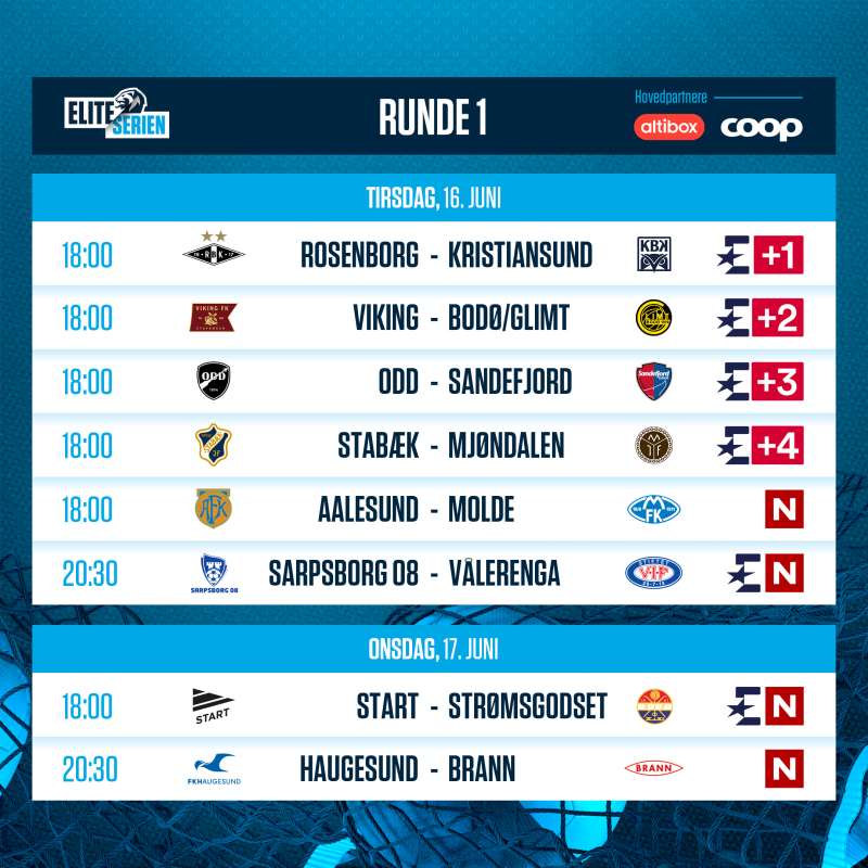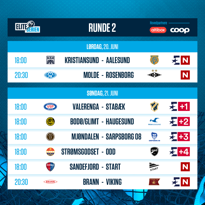Eliteserien starter igjen 16. juni, og nylig ble de tre første serierundene presentert. Nå er også de øvrige 27 rundene klare. I runde 4 til 7 er TV-kampene også klare, mens fra runde 8 avventer man situasjonen for internasjonale kamper.