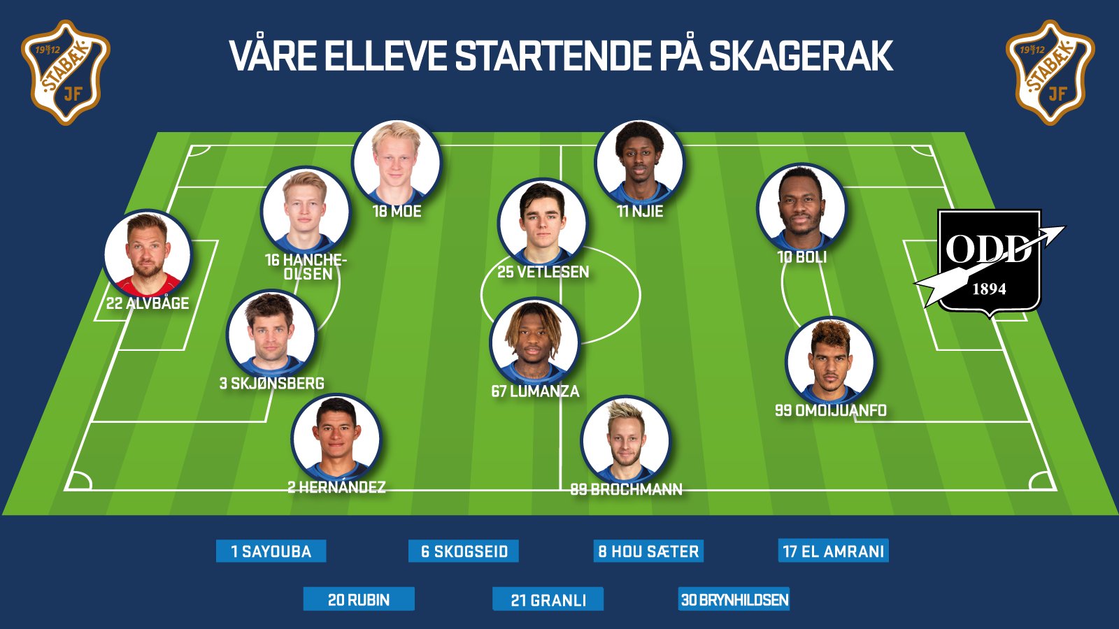 John Alvbåge - Jeppe Moe, Andreas Hanche-Olsen, Morten Morisbak Skjønsberg, Ronald Hernandez - Moussa Njie, Hugo Vetlesen, Jonathan Tortol Lumanza, Tonny Brochmann - Franck Boli og Ohi Omoijuanfo