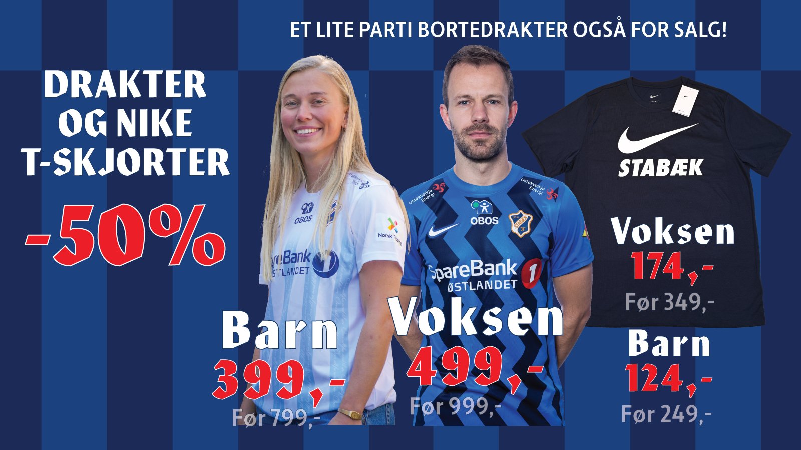 I etterkant av dette har vi fått henvendelser om det fremdeles kan kjøpes drakter til redusert pris. Dette har vi nå innfridd og det er mulig å kjøpe både hjemme- og bortedrakten, samt Nike Stabæk t-skjorter for voksen og barn i butikken på kampdag eller etter avtale ellers.