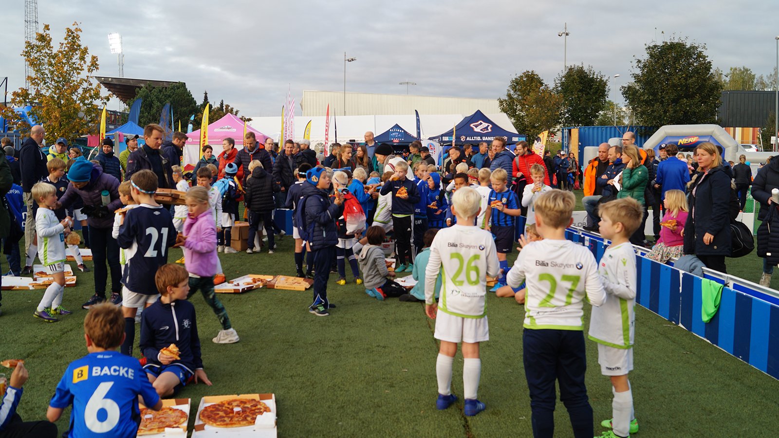 De første, ivrige gjestene var på plass i god tid før åpning klokken 17.00, og slikt er jo så hyggelig! Særlig når det er mandag, og kanskje en litt sen kamp for de aller minste. Men energien var på topp, det var full gass i ballbinger og telt, fellesbespisning på kunstgresset, legobygging og FIFA-spilling og veldig, veldig mye mer.