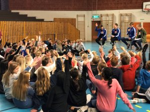 Latter og spørsmål satt løst, da 80 nysgjerrige åttendeklassinger og tre kloke fotballspillere fant tonen en mørk novemberdag i skolens gymsal.