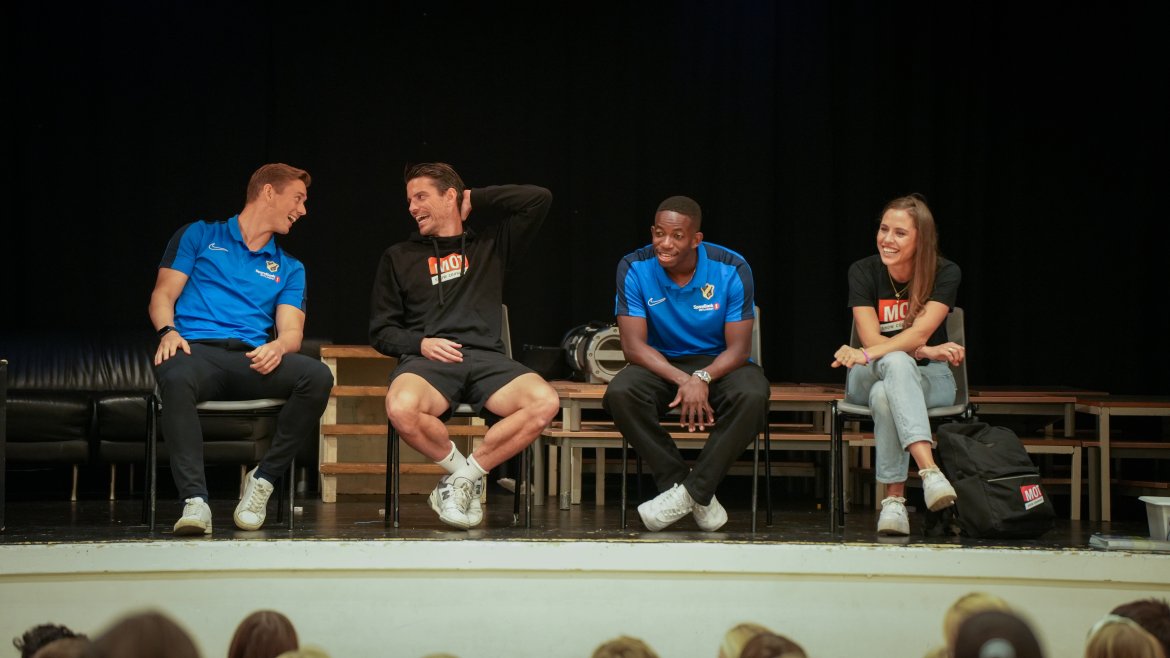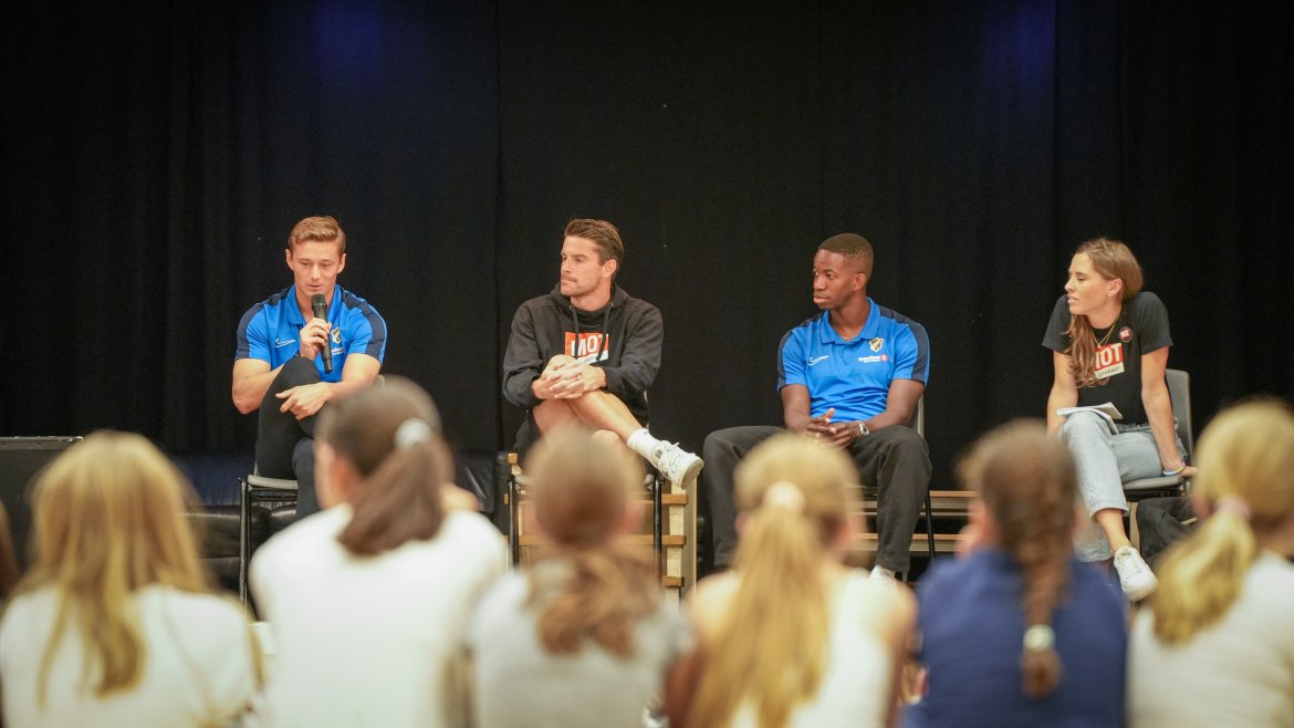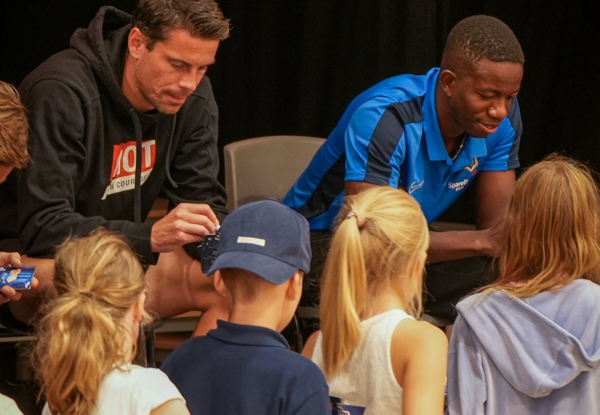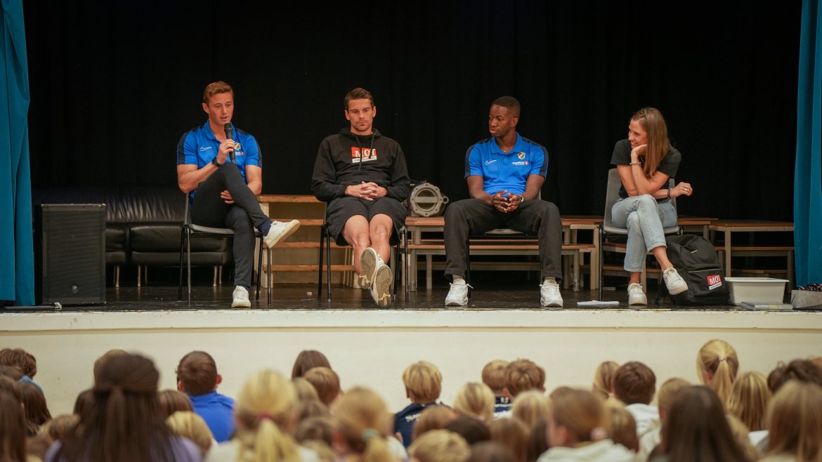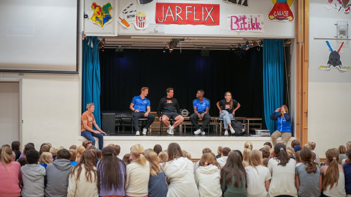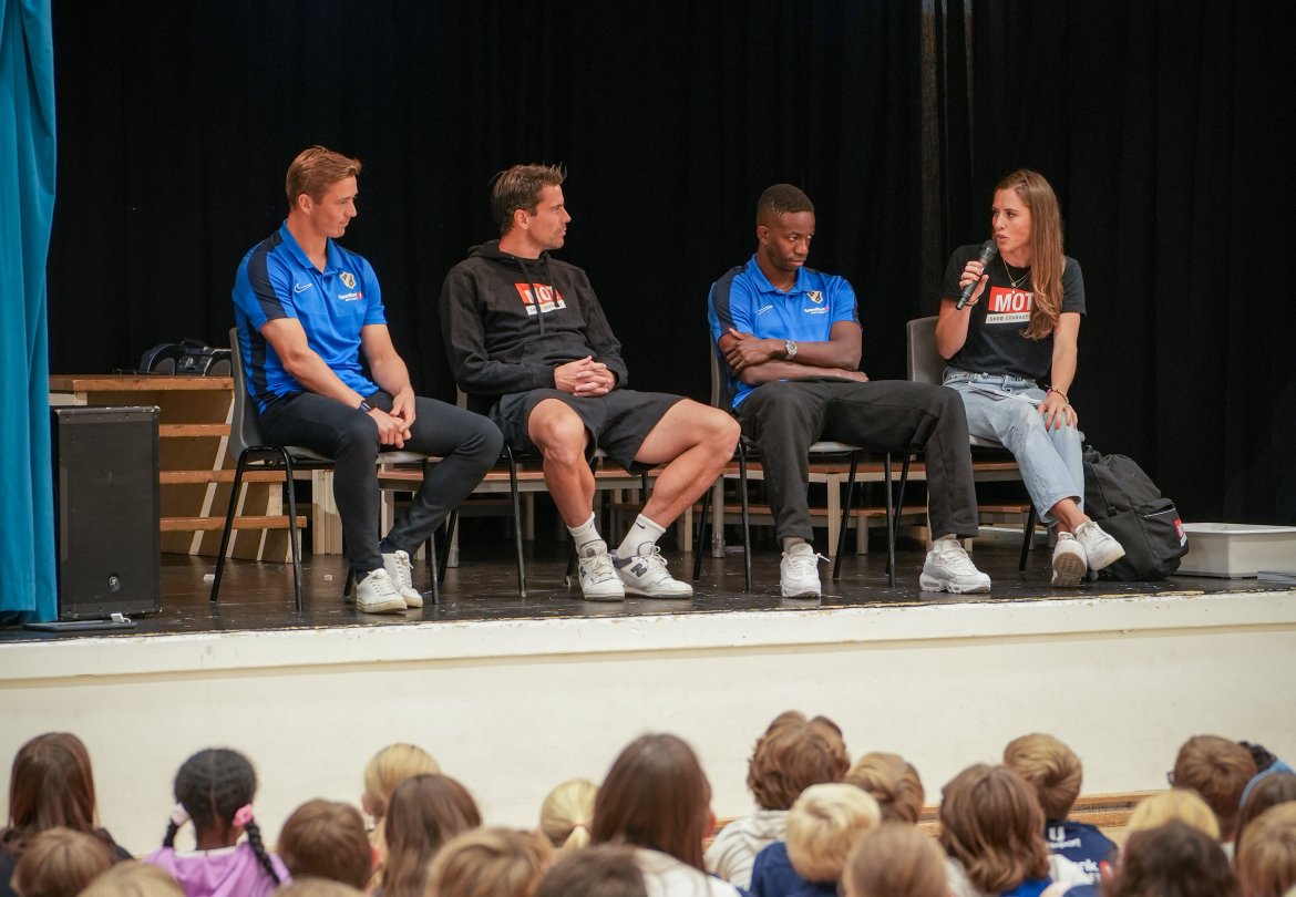 Våre flotte ambassadører Mushaga Bakenga, Fredrik Krogstad og Simen Wangberg fortalte historier fra sin ungdomstid og svarte på spørsmål fra entusiastiske barn.